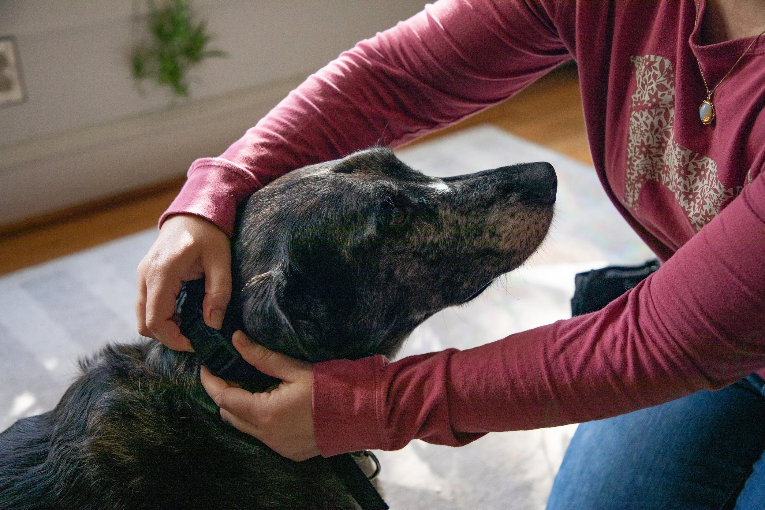 * If your dog shows signs of stress, stop training and do something calming instead - a lick mat, a kong, a game, etc. Reach out to us for help if they are still showing signs of stress the next time you try.
